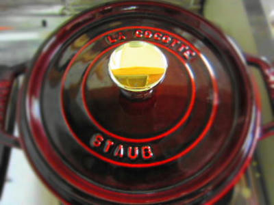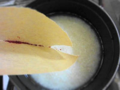 出来上がったサフランパウダーを洗ったお米の入ったお鍋(または炊飯器)に入れると
