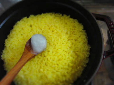 でもサフランライスを作る時は、洗ったお米とお水に2時間くらい浸してから