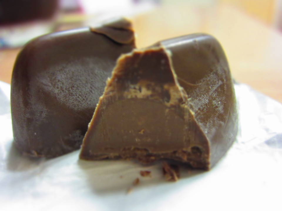 ヘーゼルナッツの風味豊かな柔らかいチョコレートをミルクチョコで包んでいて